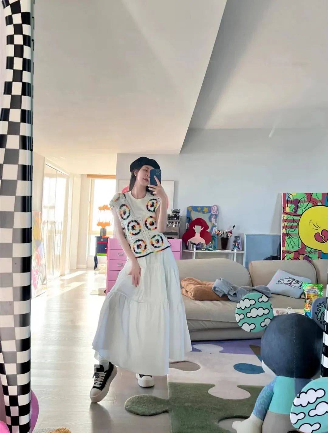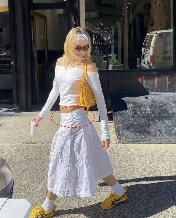 白裙子的腰腹处容易显胖,针织衫料子就厚实,塞进去更容易显腰粗。如果拿捏不好,就直接搭配短款针织衫,刚好盖住腰头位置,不塞下摆也能优化比例。