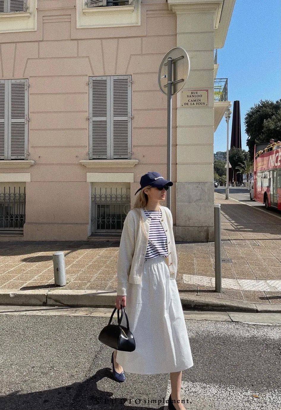 法式风必备的条纹衫也可以安排上,加条珍珠项链风格更强烈。芭蕾舞鞋也超适合这条小白裙