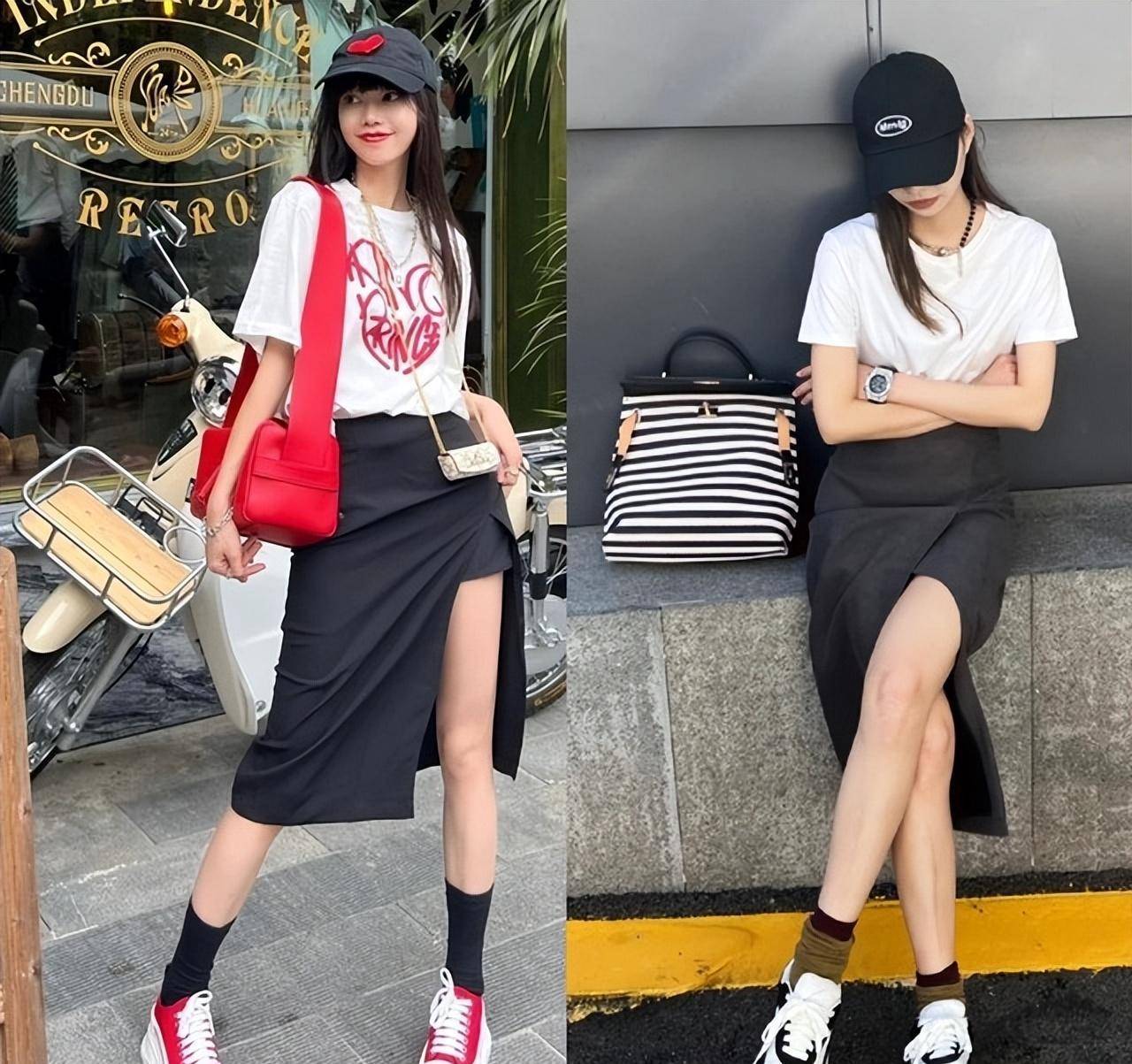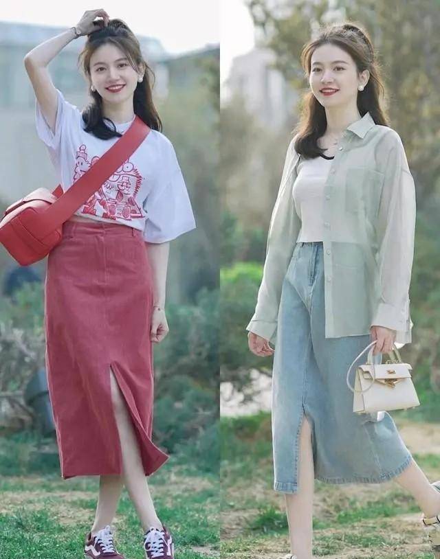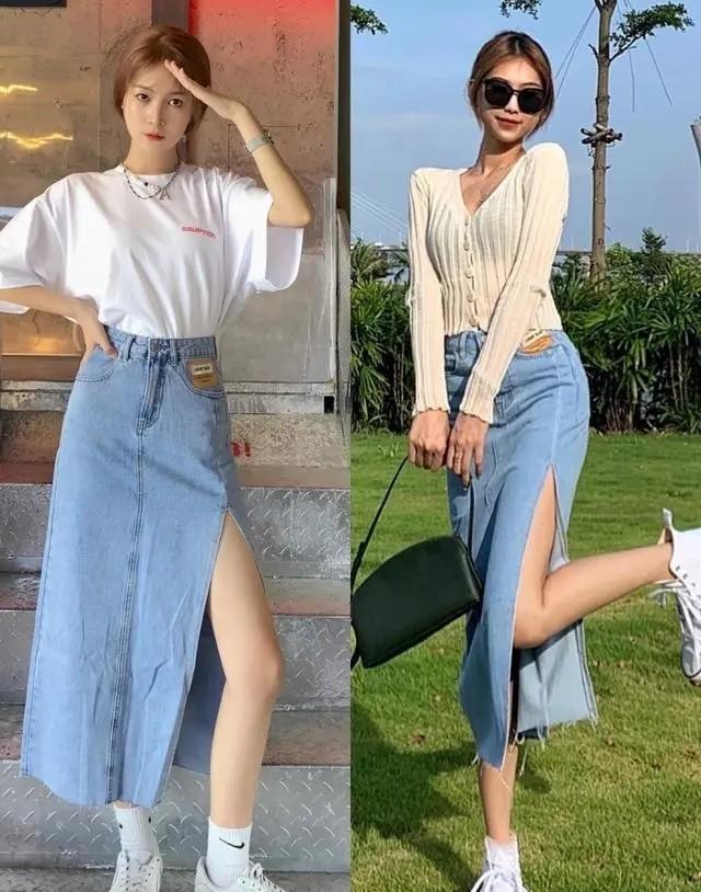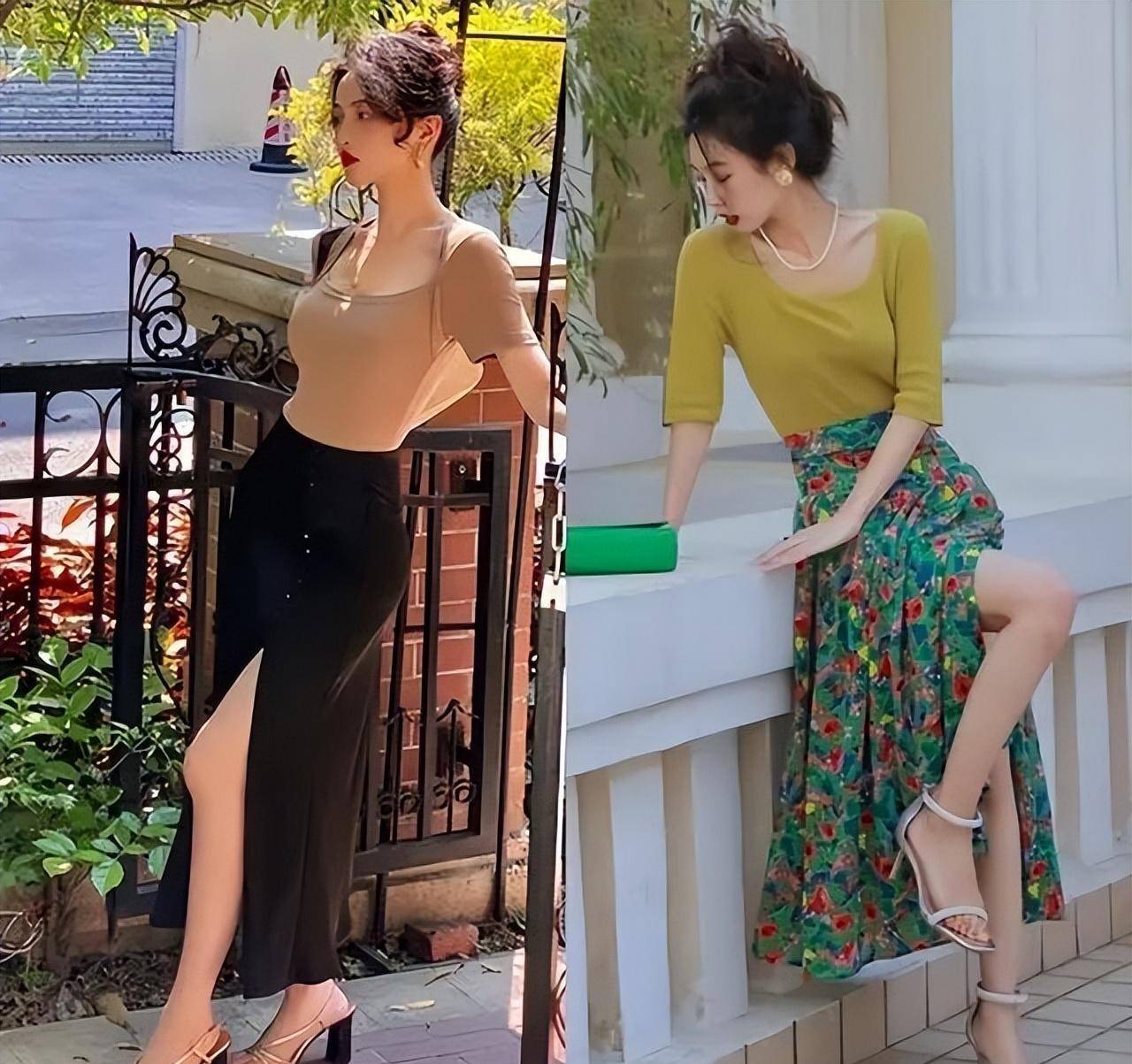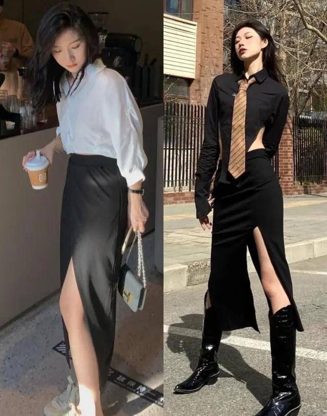 第二种则是宽松的开叉裙,一般来讲开叉裙的款式通常没有特别宽松的,我们现在说到的宽松也是相对的保留一定的空间感,只能说对于胯部和臀部的包裹感不是很强,这种具有相对空间感的开叉裙在实际穿搭当中更加舒适度一些,不会产生紧绷勒肉的负面穿搭效果,当然,秀身材的效果也会大打折扣。