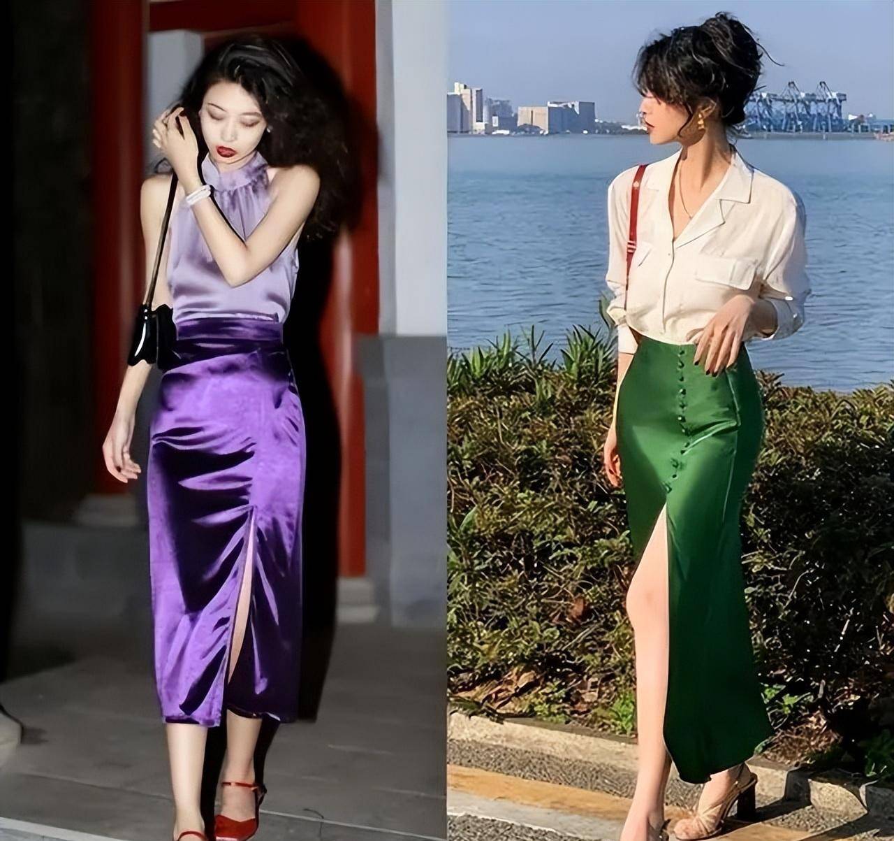 第二点,我们要来说一下开叉裙的面料,上图小姐姐身上穿的这种开叉裙是当下非常流行的醋酸面料,这种面料的特点在于特别光滑,贴身穿搭的时候会有一种冰凉感、裸感的效果,因此在穿搭舒适度的体验上是非常高的,搭配上一些靓丽的色彩,很适合穿在晚会或者是姐妹聚会的场合当中。