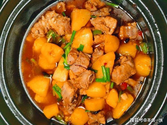 食材准备:土豆、排骨、姜片、葱段、蒜末、八角、香叶、小米辣、葱花。 做法流程: 1.排骨剁成小块清洗干净,然后冷水下锅焯水,接着加入料酒、姜片和葱段去腥,煮开以后,撇去浮沫,再捞出沥干水分,放入炖锅中。 2.土豆去皮清洗干净,然后切成小块备用,接着热锅烧油,油热以后,放入一把冰糖炒糖色,炒至冰糖融化后,再加入排骨一起翻炒均匀,裹上糖色。 3.接着加入姜葱、蒜末、八角和香叶一起翻炒均匀,炒出香味,然后加入适量的料酒、生抽、老抽、蚝油和食盐调味提鲜,再继续翻炒均匀入味。 4.接着再往里加入适量的清水,然后盖盖焖煮二十分钟,再加入土豆一起焖煮二十分钟煮熟,最后加入小米辣大火翻炒收汁,然后撒入一把葱花点缀,即可出锅开吃。