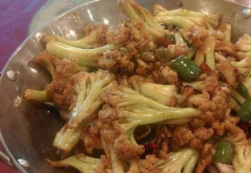干锅花菜,干锅之类的菜,和炒出来的菜味道还是不一样的,很多人在家里只会炒菜,去饭店点这道菜,虽然略贵,但是这道菜不能投机取巧,必须选用新鲜的花菜,不然吃起来会很老,而且知道才靠的就是油,所以厨师肯定不敢用差的油,再加上这道菜的口感,所以说也是一道很值得点的一道菜。