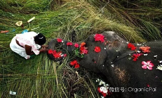20. 在印度,一头大象被火车撞伤致死,一个小女孩为它举行了花瓣葬礼