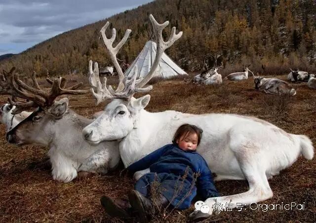 19. 蒙古的一个饲养驯鹿的牧场里,牧场主家的小女儿躺在驯鹿身上睡着了