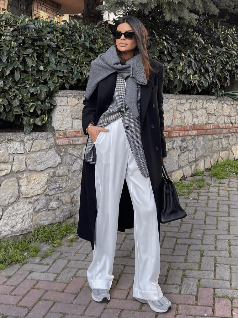 2.大衣越宽,内搭越紧,外松内紧才能避免拖沓和臃肿感。同样在叠穿时,从内层到最外层,衣服也是一层比一层更宽松,才不会显得拘谨。
