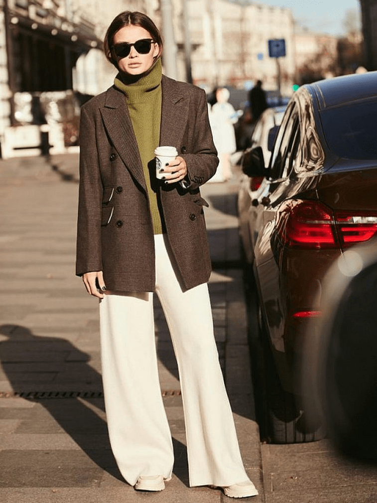 3.裤子越宽松,上衣越修身,宽松的裤管可以藏下厚实的打底裤,纤薄的上身可以让身材看起来很好。
