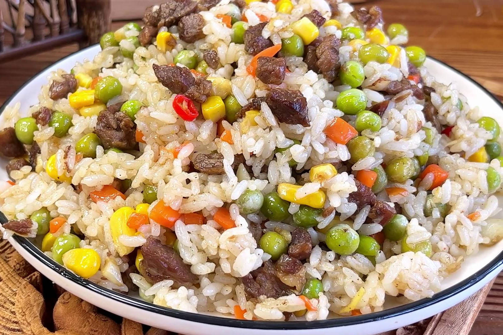 牛肉加上时蔬拌入大米饭,有菜有肉还有饭,营养均匀、味道鲜美,关键也特别省事,特别适合一个人或者两个人吃,既能补充营养又解馋。