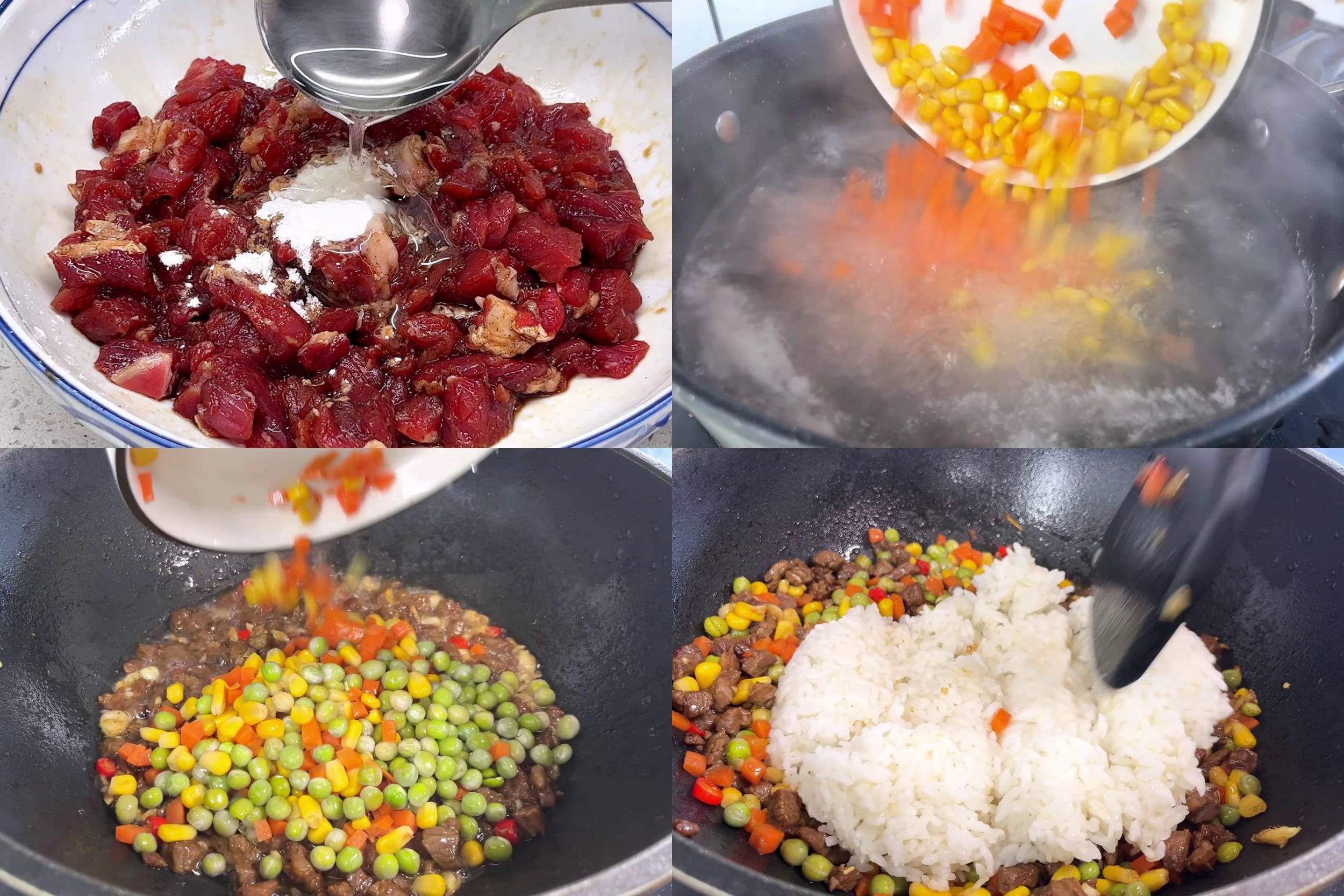准备食材:牛肉、玉米粒、豌豆、胡萝卜、小米椒、大米。