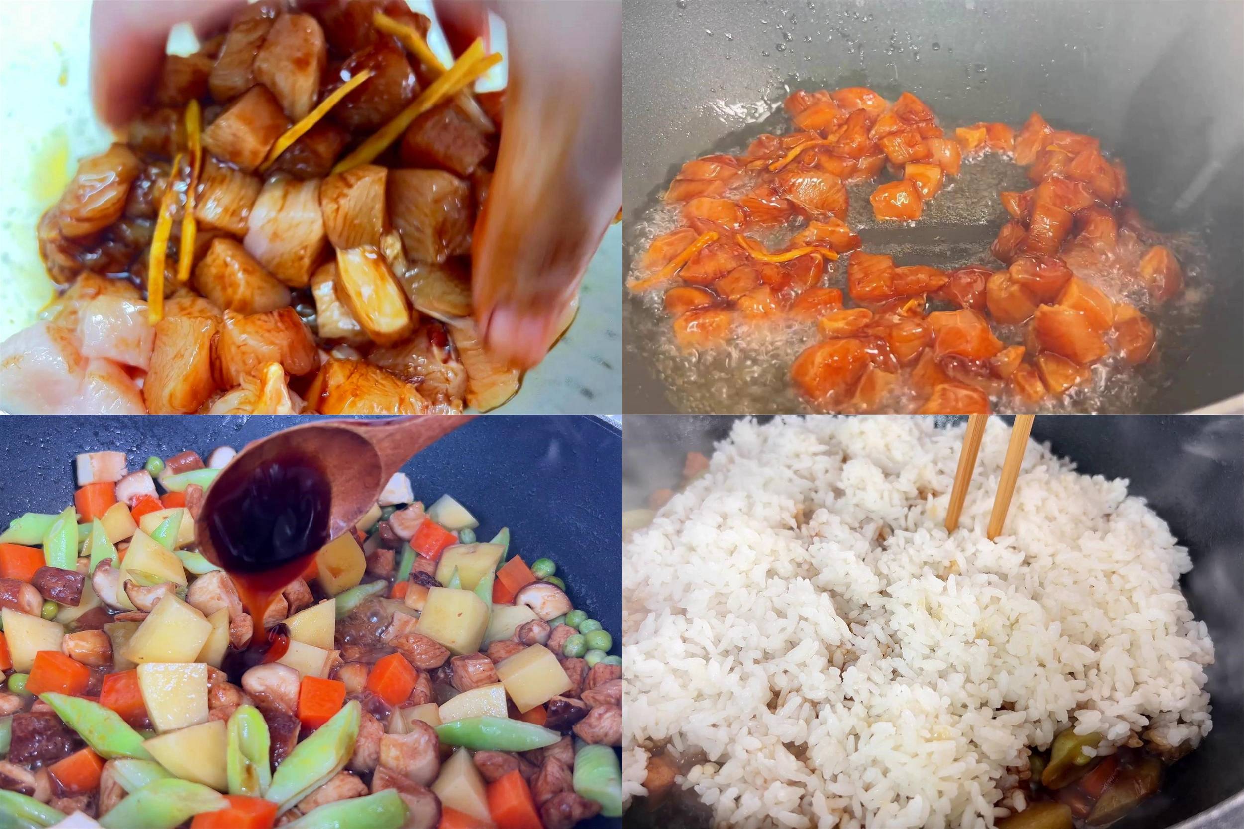 1、先取适量的大米,加入清水放入电饭锅中,焖成米饭,鸡胸肉洗净切丁,放入姜丝、一勺生抽、少量的老抽和半勺料酒,适量的盐和胡椒粉,抓拌均匀腌制10分钟,另外将香菇洗净切丁焯水,四季豆掐头去尾也焯水捞出,豌豆同样焯水,土豆和胡萝卜洗净切丁。