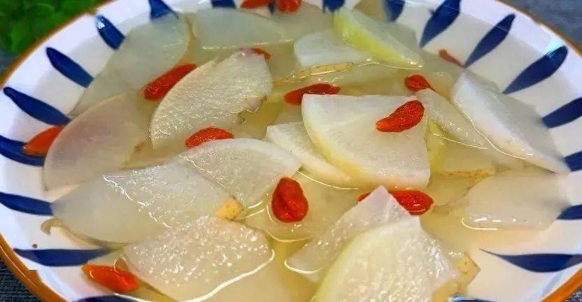 1、把梨,萝卜切成薄片,倒入到锅里。一定要冷水下锅,把水烧开,加入一大把冰糖,中小火炖煮35分钟。 2、炖煮好了,闻到浓郁的白萝卜和梨的香气,加枸杞煮一分钟就可以了。雪梨萝卜汤味道非常的香浓,喝起来非常的舒服,口感美味香甜。