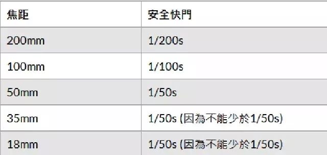 我们来看一看不同焦距镜头所对应的安全快门数值吧: