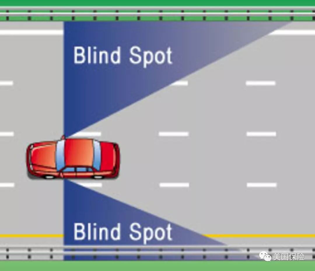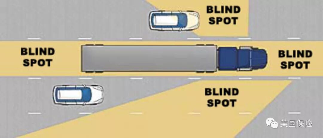 6)高速上大货车特别多,要了解盲区(Blind Spots)的概念,小车的盲区比较小,但是大货车的盲区很大(见下图)。一定要注意不要和大货车并排行驶,如果行驶在大货车的盲区里,他是看不见你的,他换道的时候很容易别到你,非常危险。之前有个在国内开了十几年车的朋友来 美国 和我们一起 自驾 ,由于路上很晒,他觉得开着大货车的阴影里挺好,其实很危险,立刻被我们阻止了。
