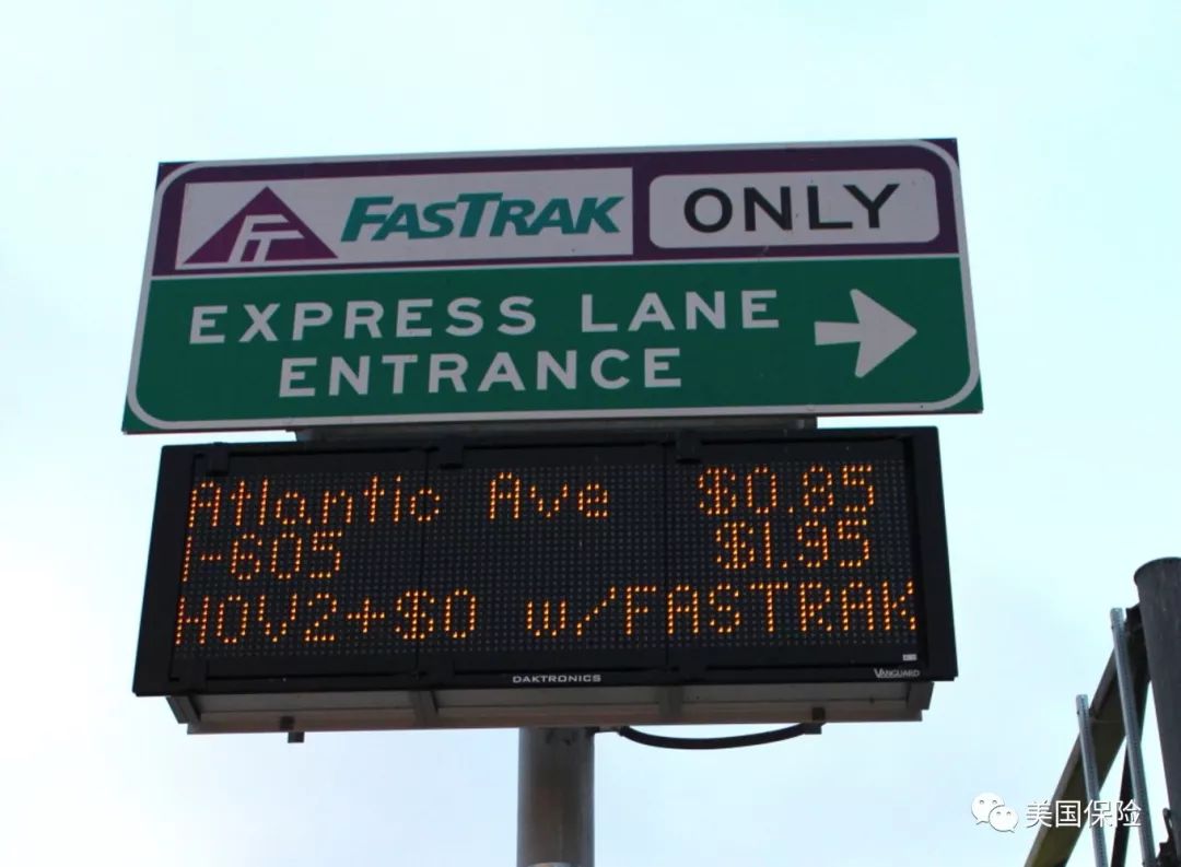 4)有些市区内高速公路设置了快速车道(Express Lane), 比如 湾区的FasTrak,和HOV或者Carpool的车道一样一般都是最左侧的车道,需要注意的是快速车道是收费的,需要在网上提前缴费,或者走后48小时内缴费,不然会被罚款,我们刚来 洛杉矶 的时候就被罚过一次。快速车道经常会在高速上设置广告牌,写着从哪儿到哪儿多少钱,需要注意的是你看到这个广告牌并不代表你进入了快速车道。这种牌子就是个广告,一来告诉你快速车道收费,二来告诉你很便宜,堵车的时候可以走省时间。之前有朋友在 旧金山 附近看到这种广告牌以为进入了收费公路,还专门在问答里问怎么缴费,其实只有最左边的快速车道收费,其它车道并不收费。