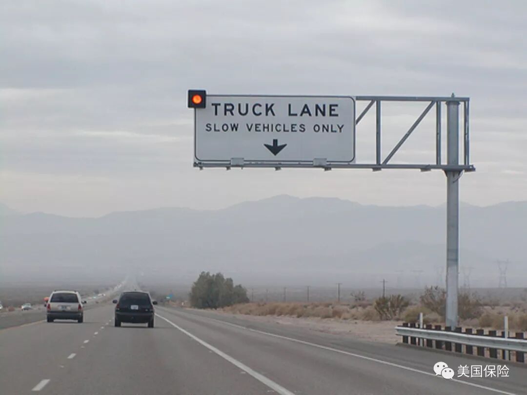 7)高速公路限速一般有两中牌子,一种写着普通车限速,一种写着大货车(Truck)的限速, 比如 经常普通车限速65mph,大货车限速55。大货车一般都在比较靠右边的慢车道,有的高速公路( 比如 从洛杉矶 到 拉斯维加斯 的15号公路)在上下坡的路段还有大货车专用道。开车比较慢的同学小心,别开到货车专用道上。