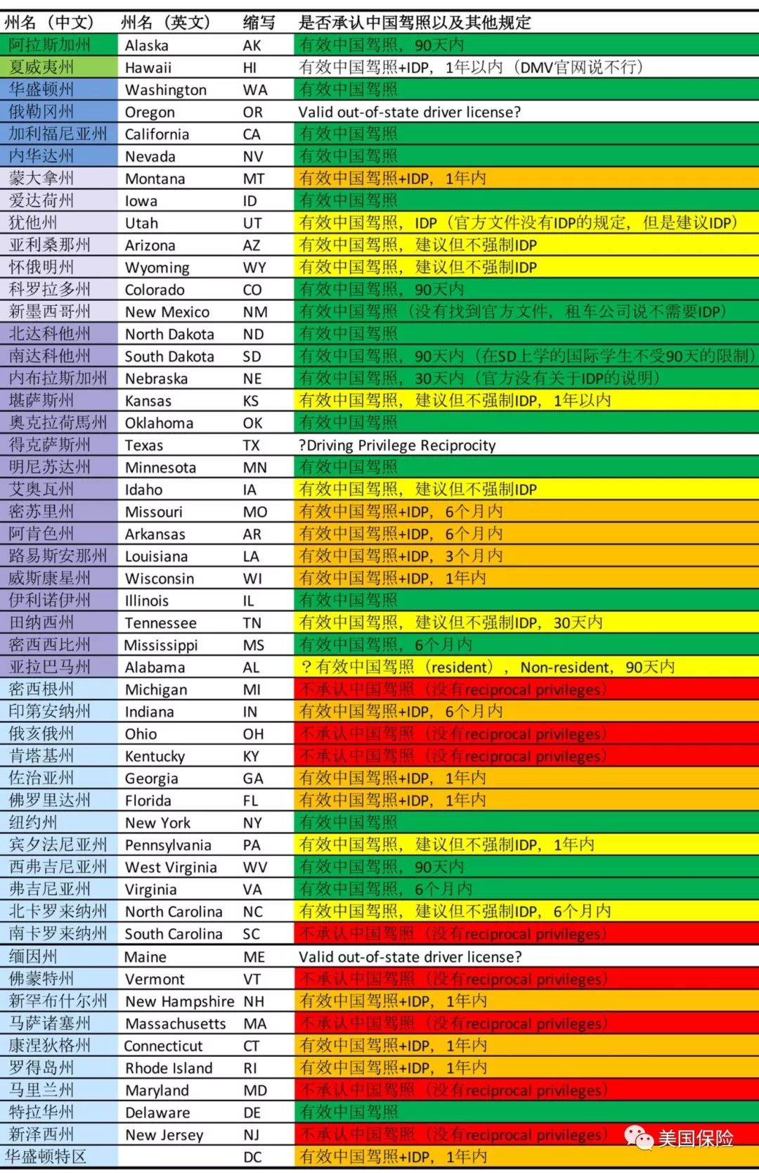 以上图表中州名的颜色显示其所在的时区,右边在文字表述的同时,用不同的颜色把各州对 中国 驾照的对顶分为五类:
