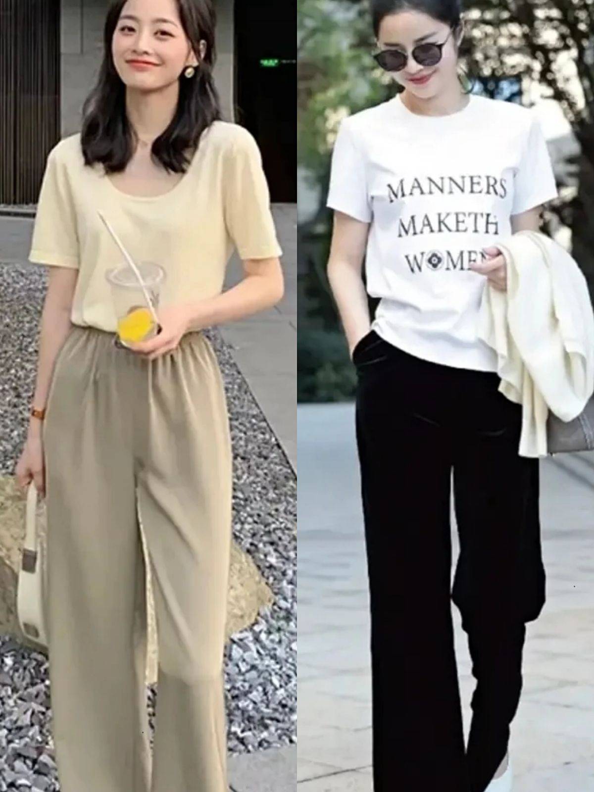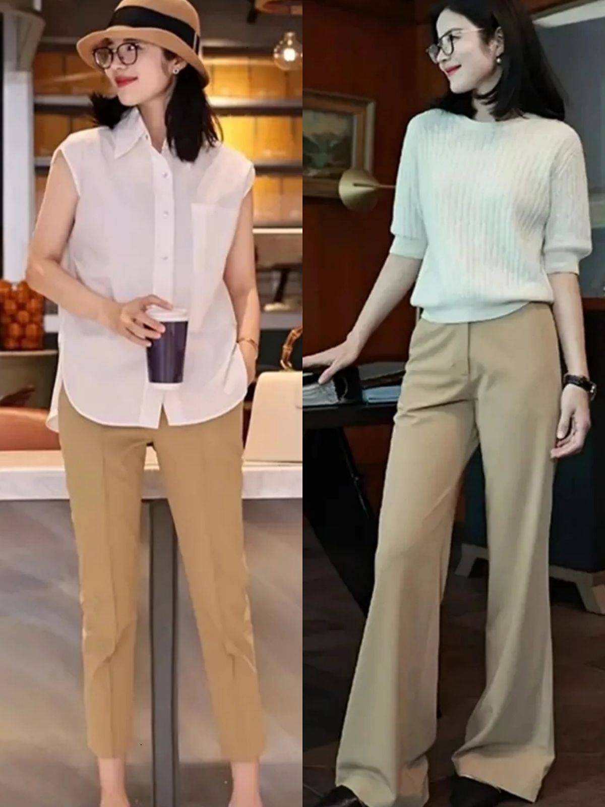 如蓝色衬衫+白色阔腿裤、灰粉色针织衫+白色半裙等等。
