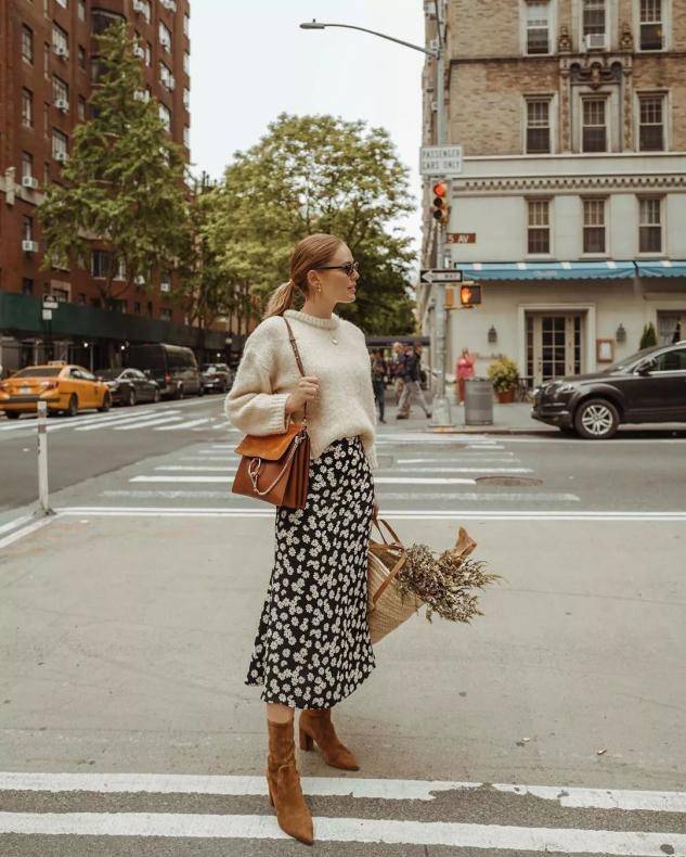 掌握好繁和简的度才能让造型不单调也不繁乱。针织衫和裙子款式、花纹一繁一简是打造穿搭平衡感的方法。用纯色的针织衫搭配碎花裙,或者用菱格花纹针织衫搭配纯色裙子,整套look看起来就很舒服。