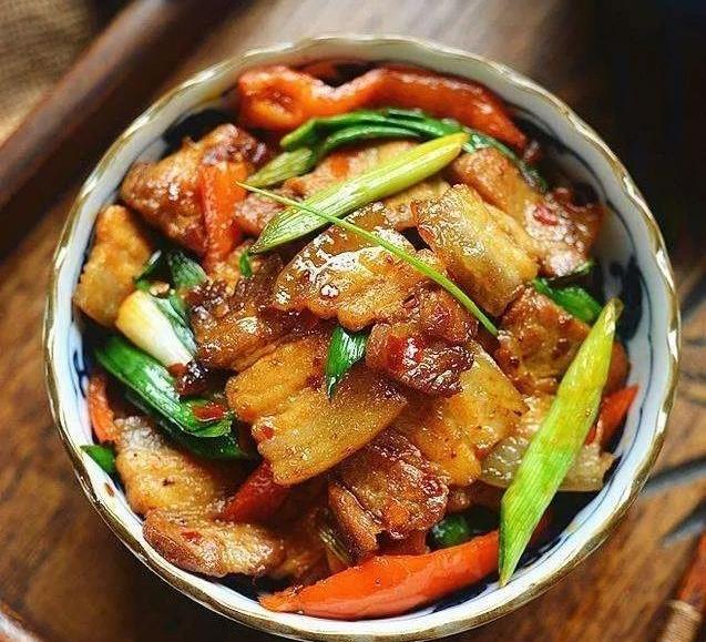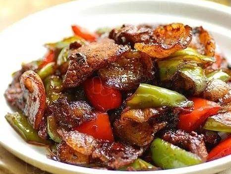 7、 再将准备好的辣椒倒入,翻炒均匀即可,超级香喷喷美味的回锅肉就出锅了。