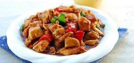 4、下鸡肉大火翻炒几下,将鸡肉炒散炒变色。