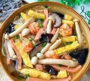 食材:金针菇、香菇、蟹味菇适量、胡萝卜半个、鸡蛋1个、虾仁10个、葱末少许、盐少许