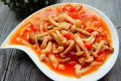 4、火锅油,将白蘑菇放入锅中煸炒,倒入少许酱油,然后倒入小番茄炒匀。