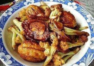 材料:鸡蛋6个 猪肉160G,花菜300G,姜片4片,八角1颗,料酒,食盐2小勺 蒜头2瓣 桂皮1片 老抽适量 白糖一小勺 香葱两根菜 油适量