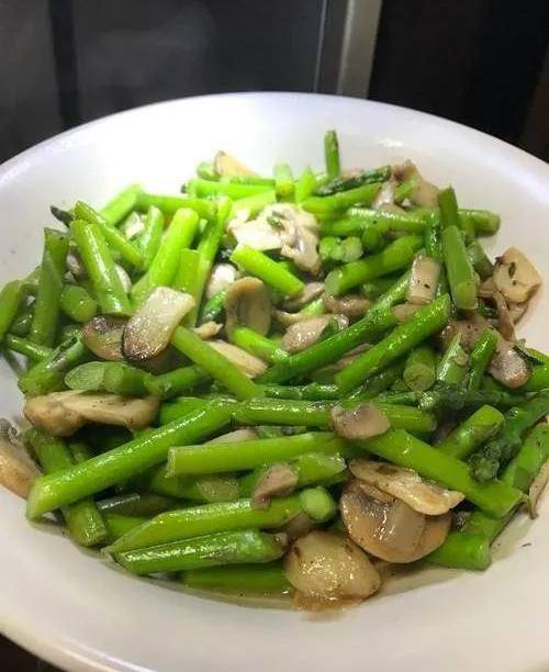 6、倒入芦笋和草菇翻炒,放入蚝油和少许盐翻炒均匀即可。