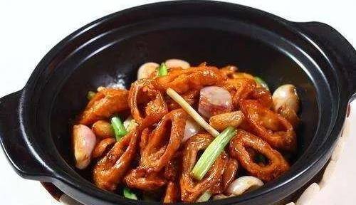 锅中烧油,油热后倒入姜蒜翻炒出香味。倒入猪大肠翻炒2分钟。加入生抽、老抽、料酒、醋、甜面酱、胡椒粉和少量的水大火焖煮5分钟。