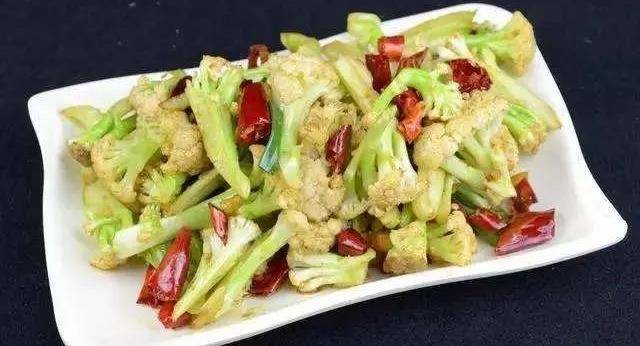 3.锅加油烧热,下入花菜大火炒去水分,再用中小火炒至断生,盛出待用