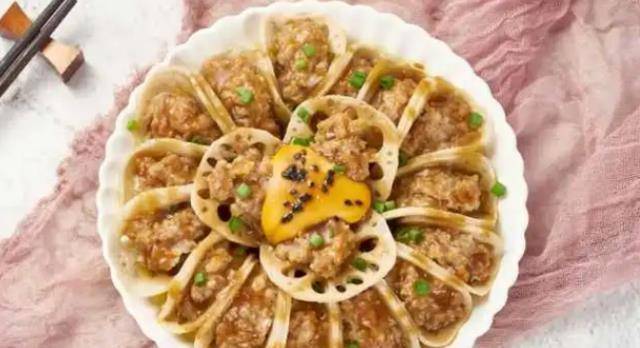 再把少量的肉末放在莲藕上,摆在盘子里,每一块藕片之间都要保持一定的距离。