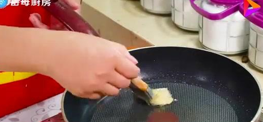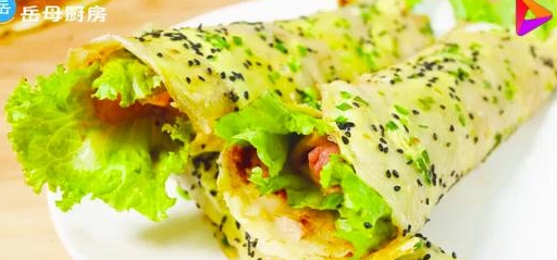最后将煎饼白面朝上,刷一些酱料。放上生菜、薄脆、火腿肠。慢慢卷起。