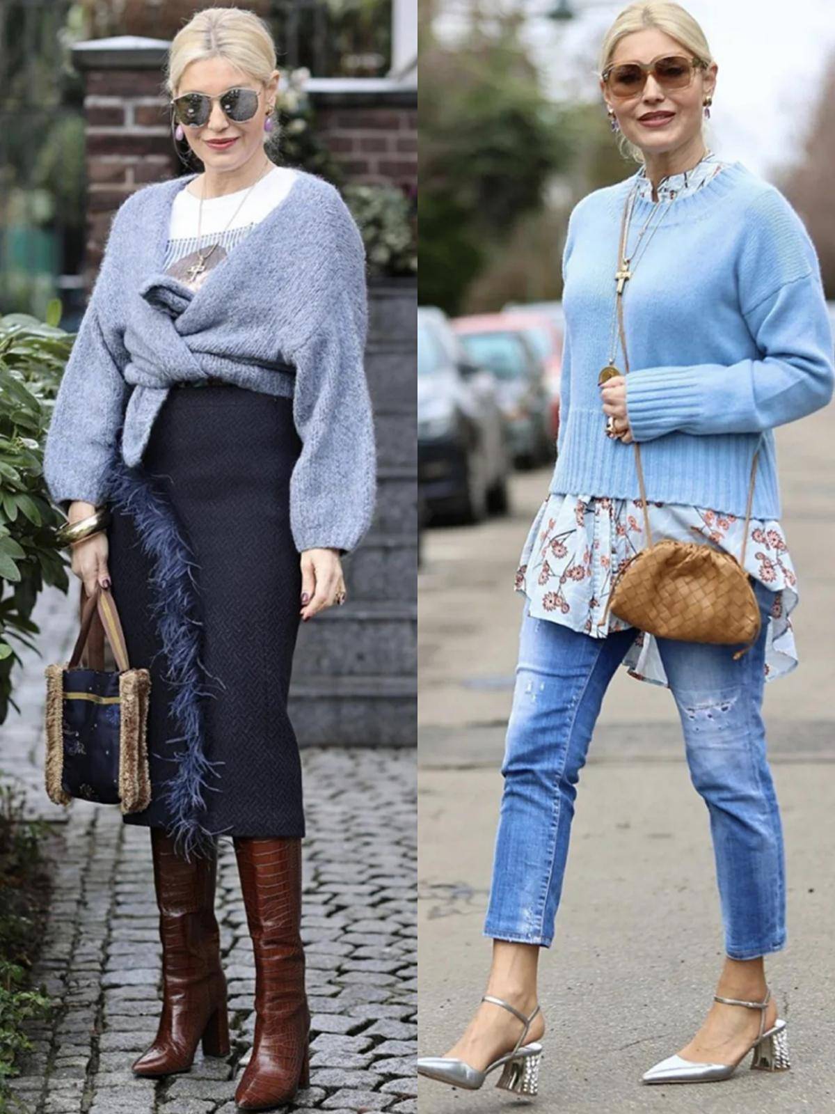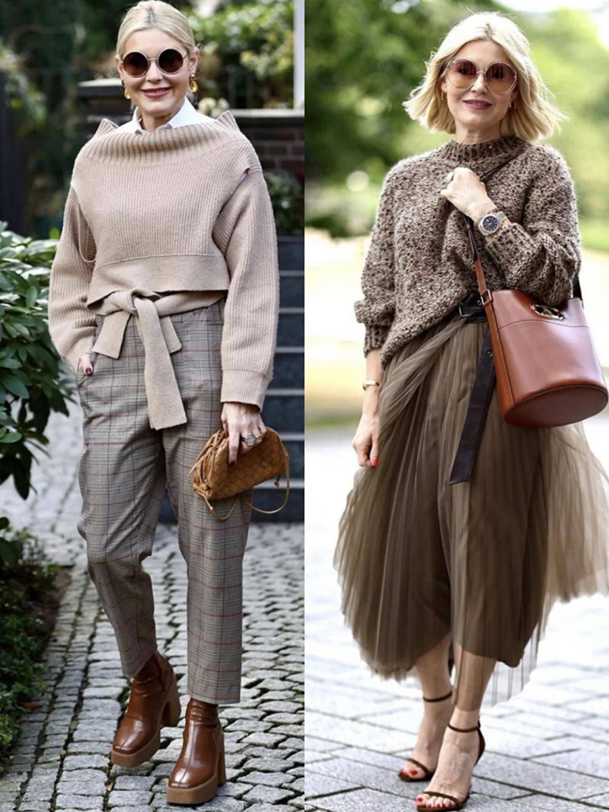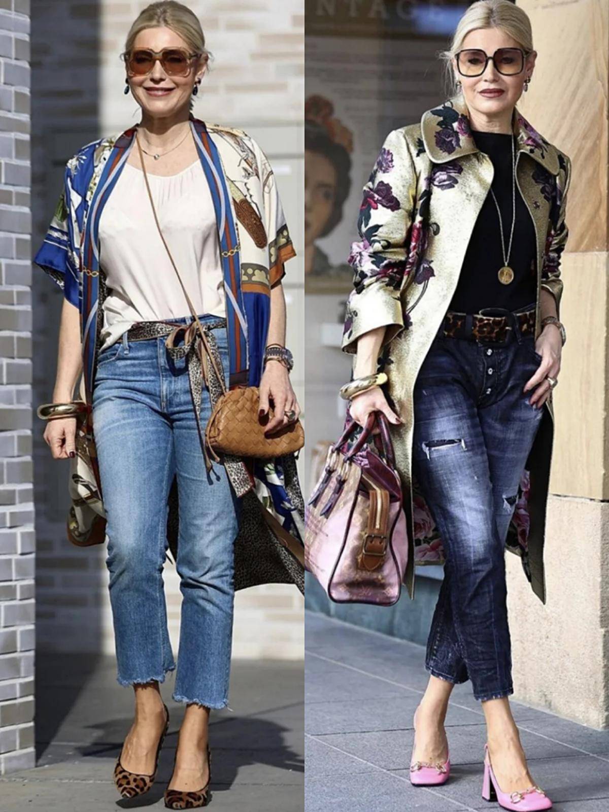 除了借助印花单品来提升时尚气息外,这位时尚奶奶也会根据腿型来选择裤装,如高腰九分锥形牛仔裤、高腰九分西裤在她的搭配中很常见。一来这类裤装修饰腿型、延伸腿长;二来能够营造出干练气息,让整身穿搭摩登不失利落。