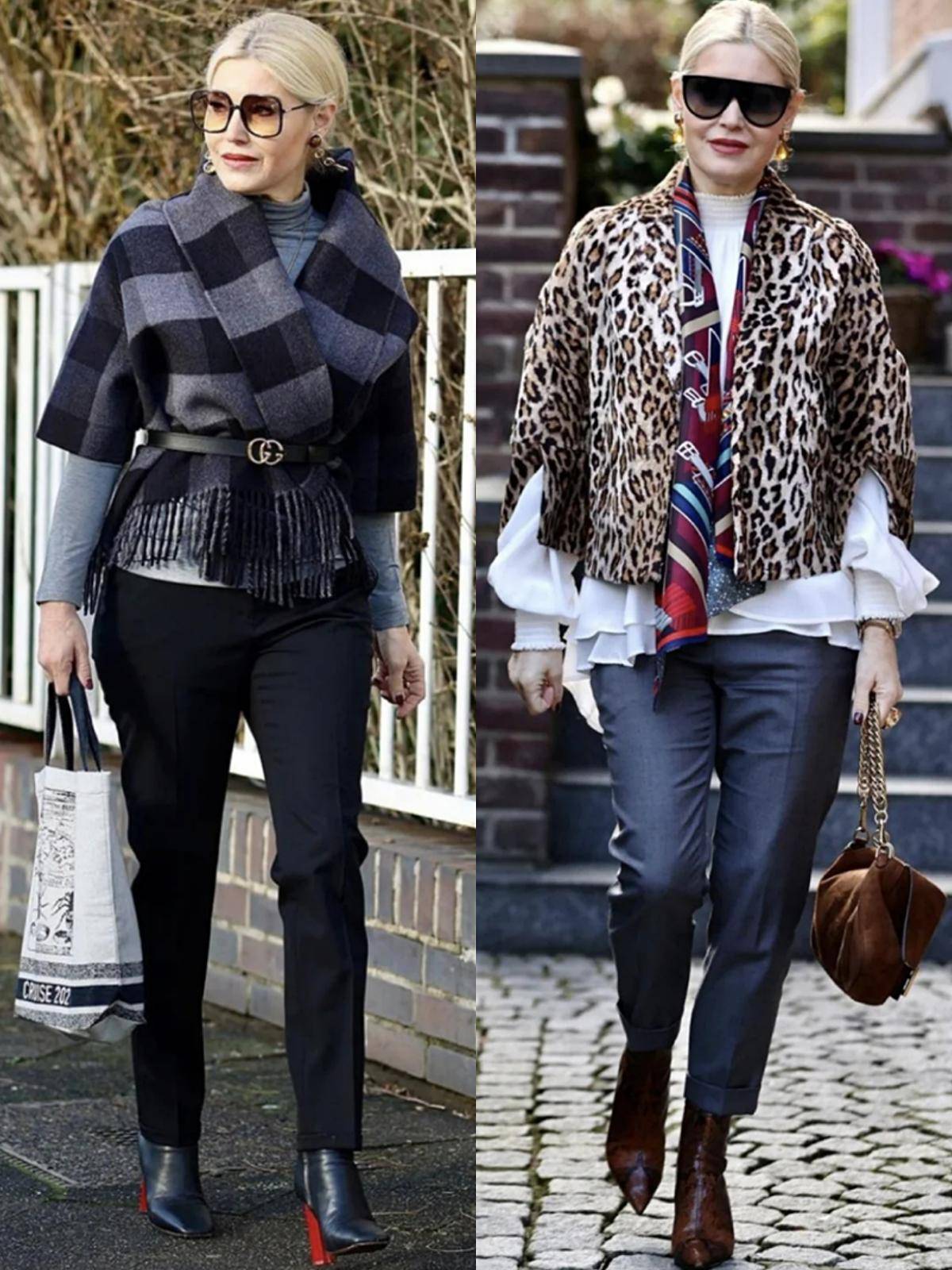 黑灰格纹流苏上衣叠穿灰色修身打底衫,黑色裤装修饰腿型,腰带点明腰线,时尚又大气;豹纹短款上衣叠穿白色束袖衬衣,灰色烟管西裤与上衣构成柔与力的碰撞,干练不失狂野,是摩登高级的时髦精没错了。