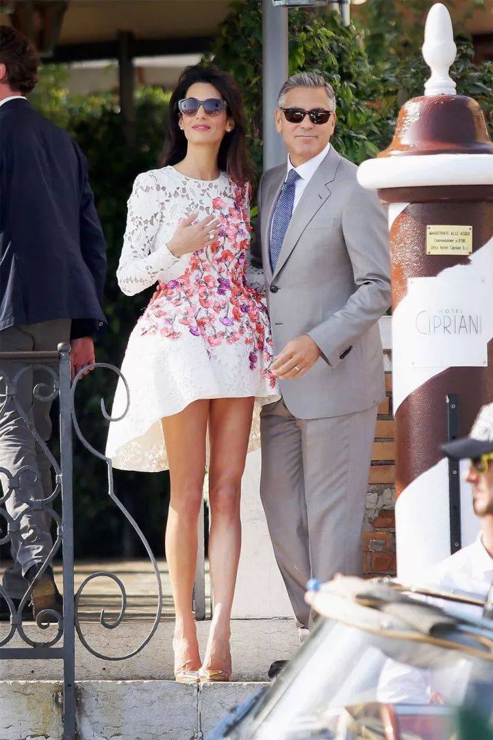 2014年和克鲁尼在威尼斯度假的时候,Amal穿着Giambattista Valli的高定小裙子,不仅秀了大腿,而且少女感满满,让人过目难忘。