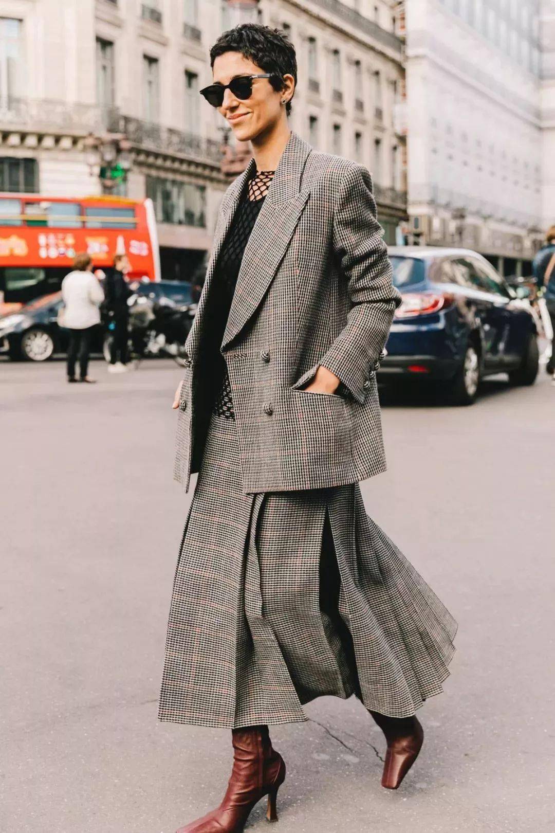 格纹裙+中筒靴的搭配,不妨试试再搭配一件西装外套,将复古和精致发挥到极致。