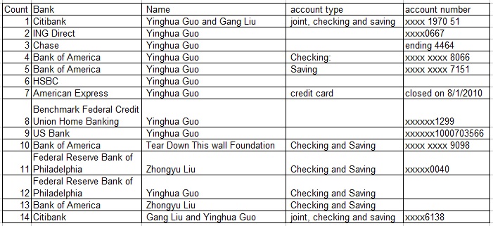 Exhibit 19. Yinghua Guo had at least 14 bank accounts as listed above. Gang Liu has asked Yinghua Guo to provide all the bank statements for discovery. However, Yinghua Guo refused to provide any of her bank statements in the past 30 months!