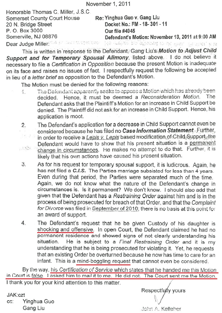 1.25. On June 7th, while the police officers were serving the protection order to Gang Liu, Yinghua Guo made several phone calls to Gang Liu and asked Gang Liu to meet with her. Gang Liu reported to police officers. However, the police officers just told Gang Liu that never report to police for family issues. Police officers refused to take Gang Liu's report! Then, Gang Liu went to the Somerset County Superior Court to file counter-complaint against Yinghua Guo.