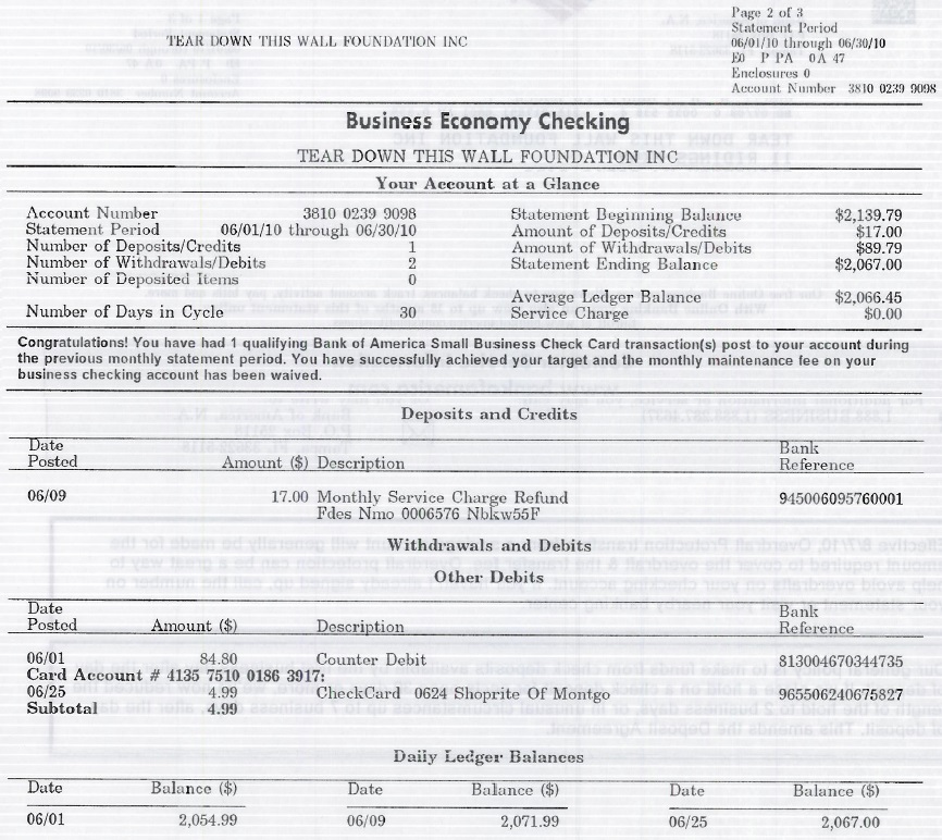 Exhibit 14. Without Gang Liu's approval, Yinghua Guo used Gang Liu's name and Juntao Wang's name to create an entity "Tear Down This Wall Foundation". Then, Yinghua Guo created a bank account for this entity. This is the bank statement for the month of June, 2010. Clearly, Yinghua Guo committed ID theft for creating this bank account.