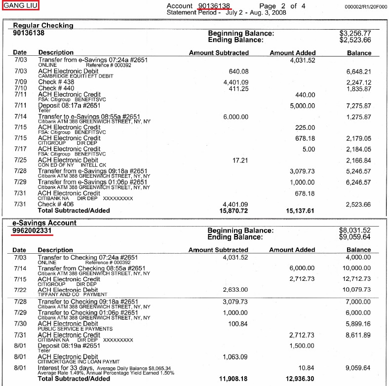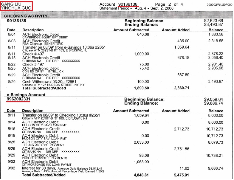 Exhibit. 17. Gang Liu and Yinghua Guo used to own two joint accounts with Citibank. Here lists some of the bank statements for one of the joint account
