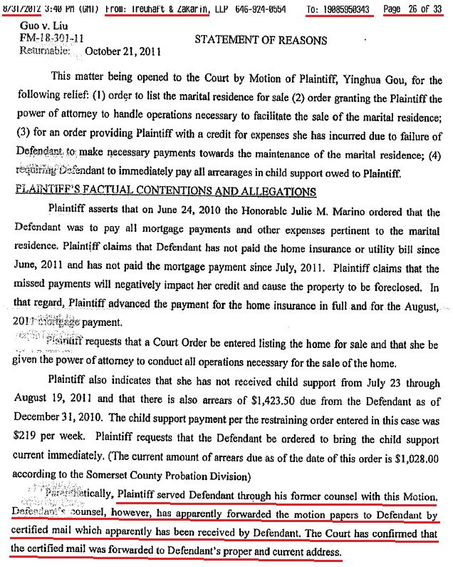 Exhibit 26. On September 9th, 2010, Ms. Picillo submitted this "Answer and Counterclaim" to the Somerset County Superior Court. At the same time, Mr. Allen P Comba represented Yinghua Guo submitted the original divorce complaint to the Court. Obviously, it was Judge Picheca and County Counsel Thomas Miller arranged the two attorneys submitted Yinghua Guo's complaint and Gang Liu's Counter-complaint at the same time!