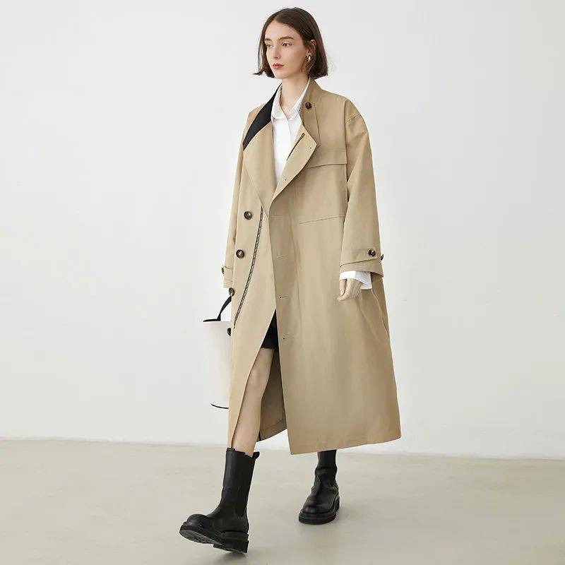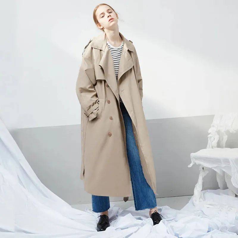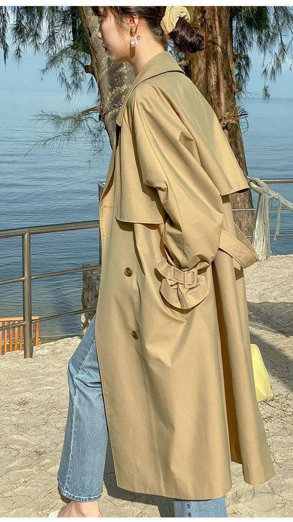 经典的卡其色风衣,因为宽松的款型变得休闲不少,过膝的长度显高显瘦,走起路来随性带风,飘逸帅气。