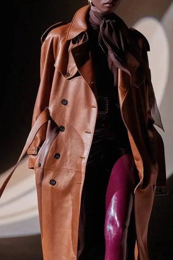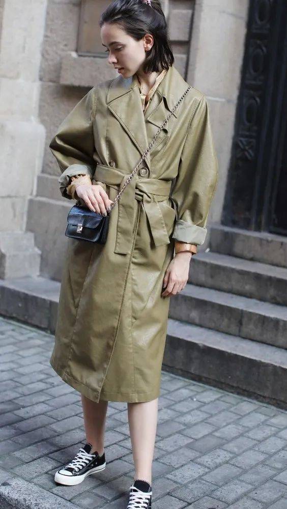 想要突破风衣的想象力,皮革风衣是务必要安排上的,立马升级你衣橱的品位战袍!尤其人造皮革材质环保又省钱,外形和舒适度都不输真皮。