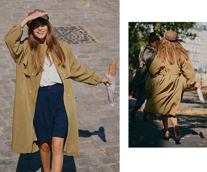 这件风衣同样廓形感十足,戴上一顶贝雷帽很有电影画面感。双排扣的设计中和了单挑的前襟,挡风板远看有点小斗篷的感觉,落叶芥末绿给秋天加了一层浪漫滤镜。