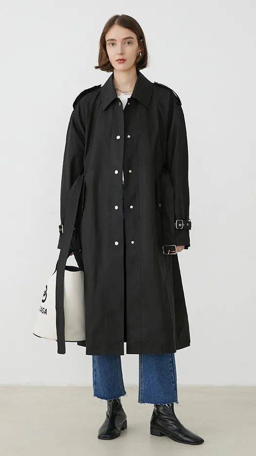 挺括的廓形,将身体的肩部、背部线条修饰的很干净利落。加上黑色的高级神秘与百搭,这件风衣,秋冬季节随便穿穿就很好看。