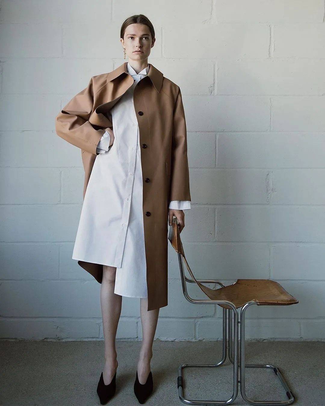 在经典双排扣的风衣款型上尝试不对称设计,融合拼接以及极简主义的风格形态,中性与舒适度同在。