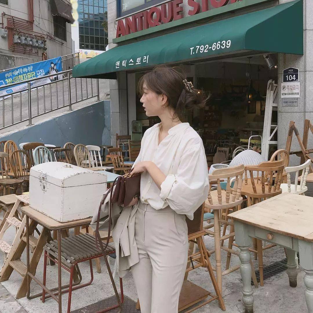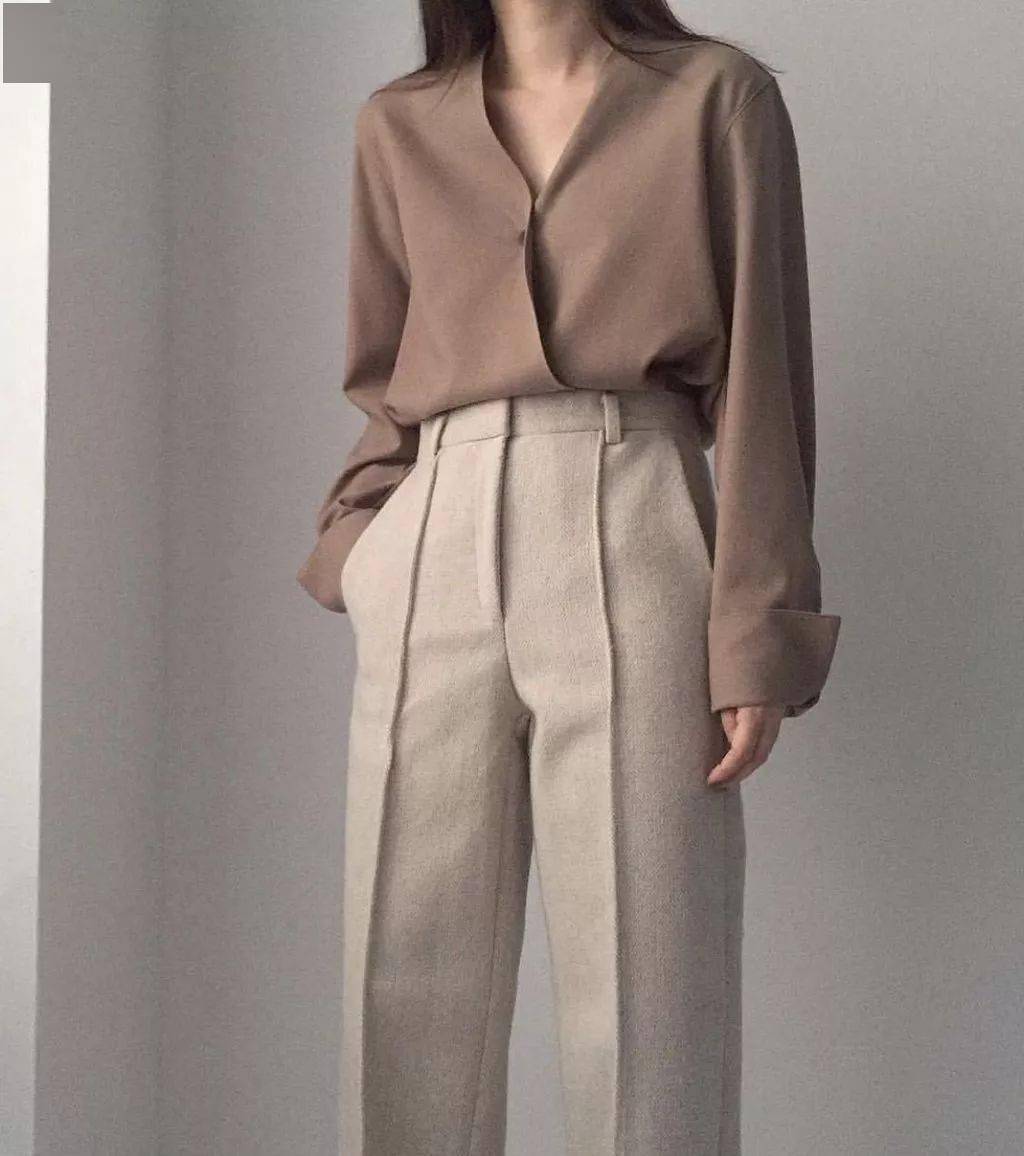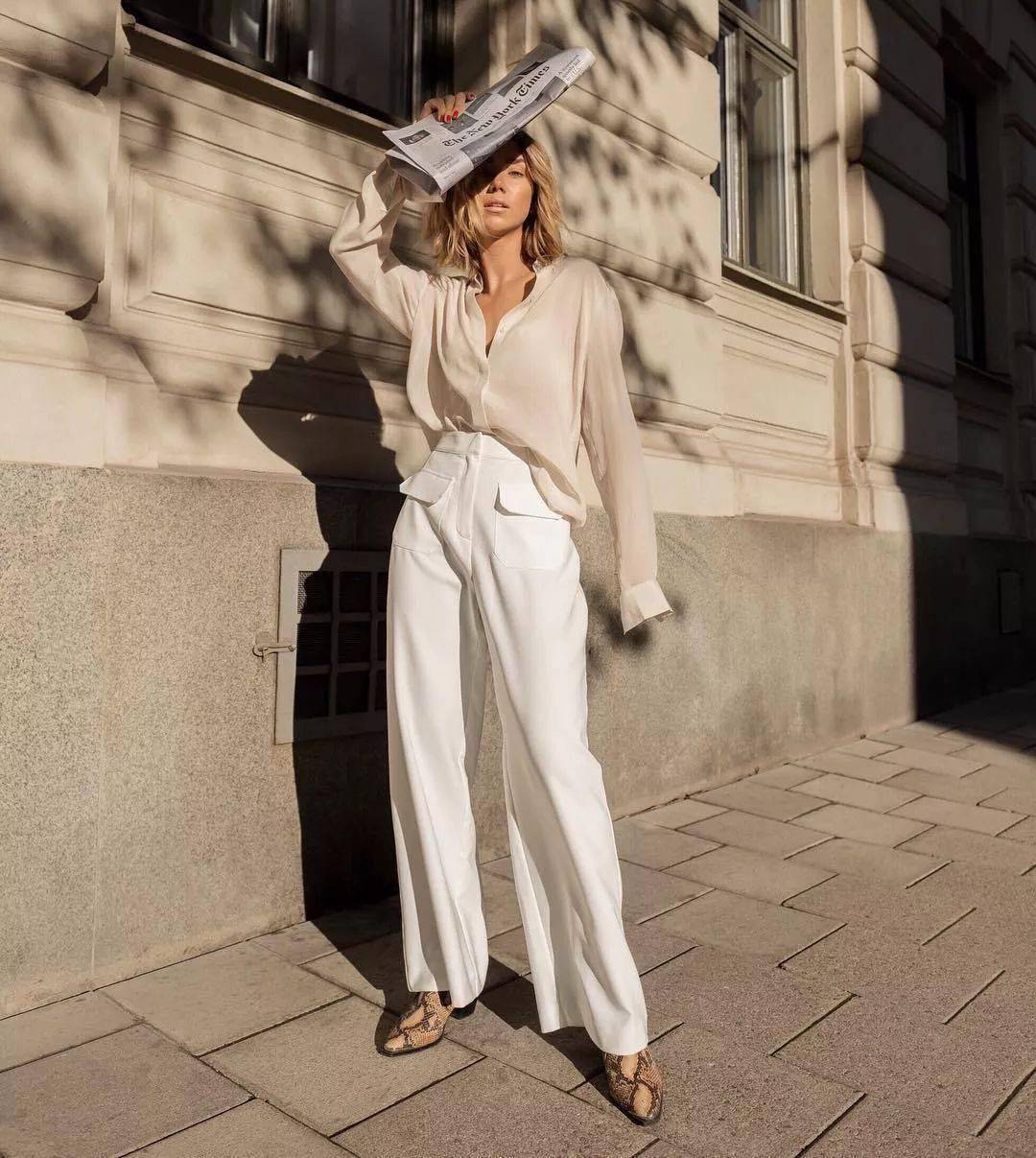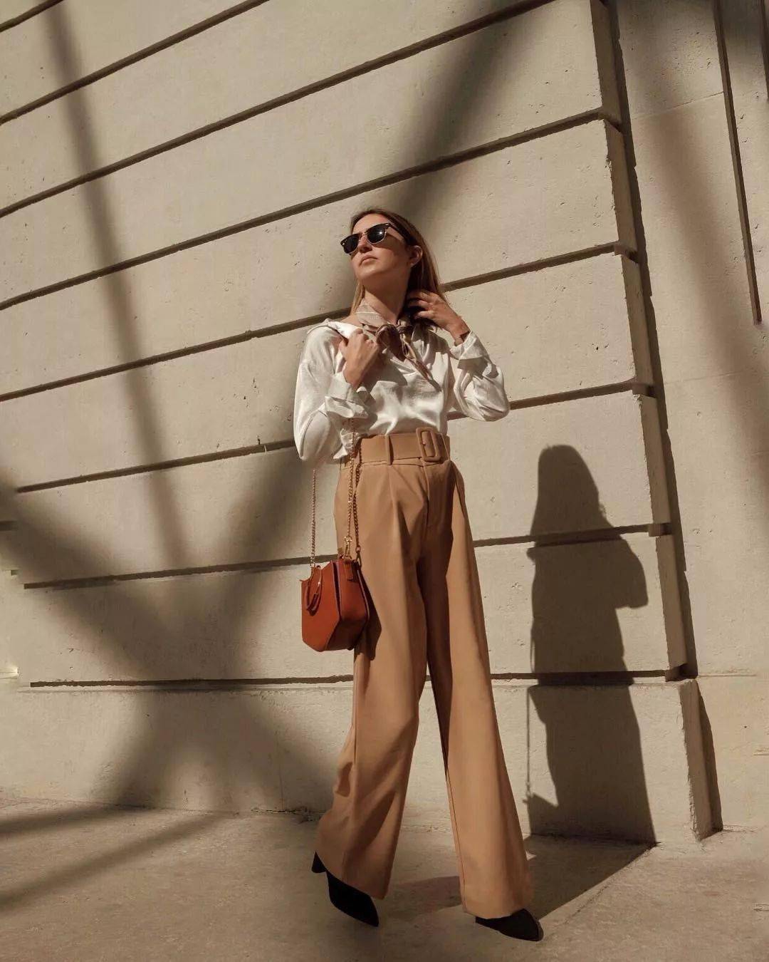 衬衫与奶奶裤在色调上可以有深浅递进,这样可以营造出来的同色系搭配会更具时髦层次感。