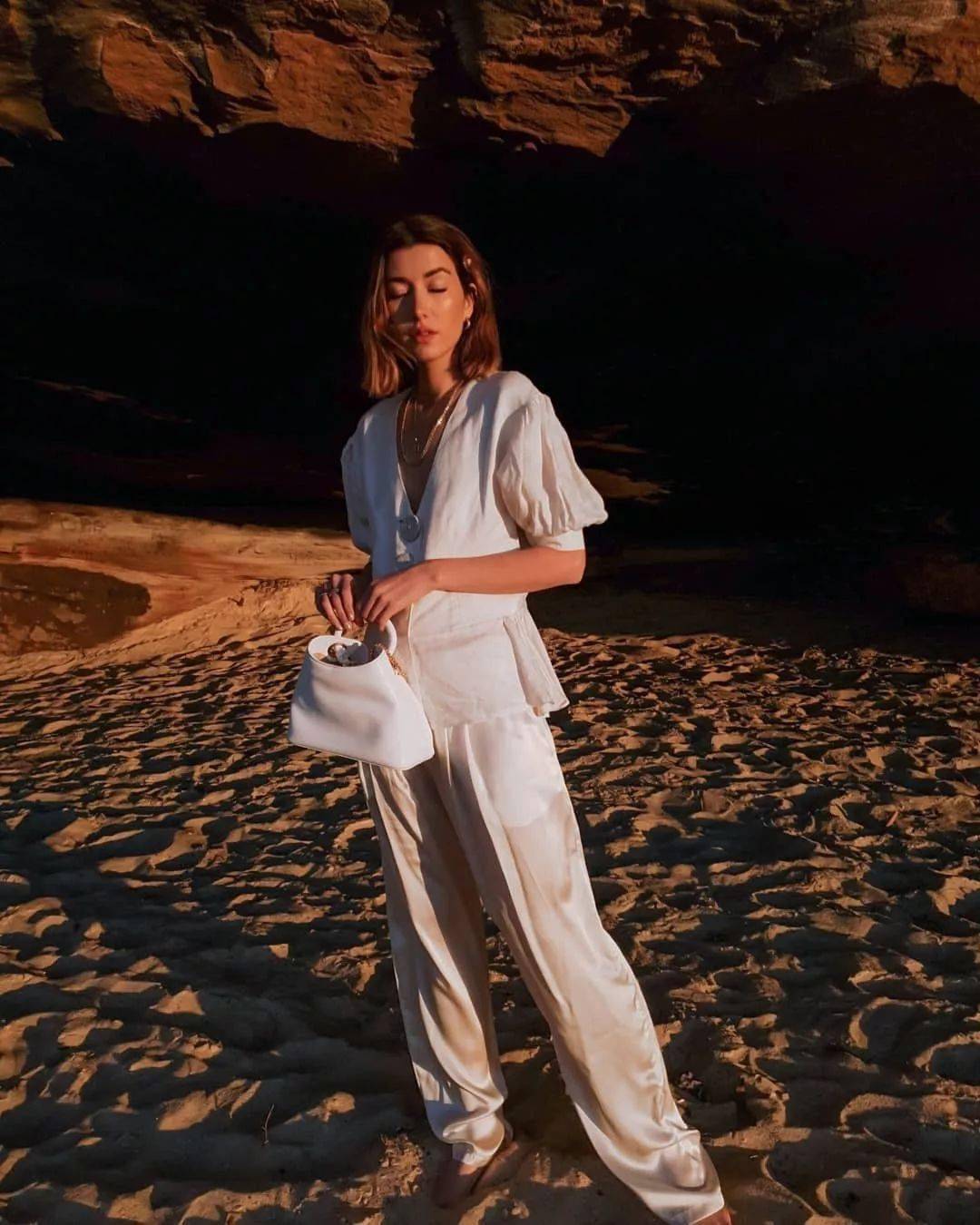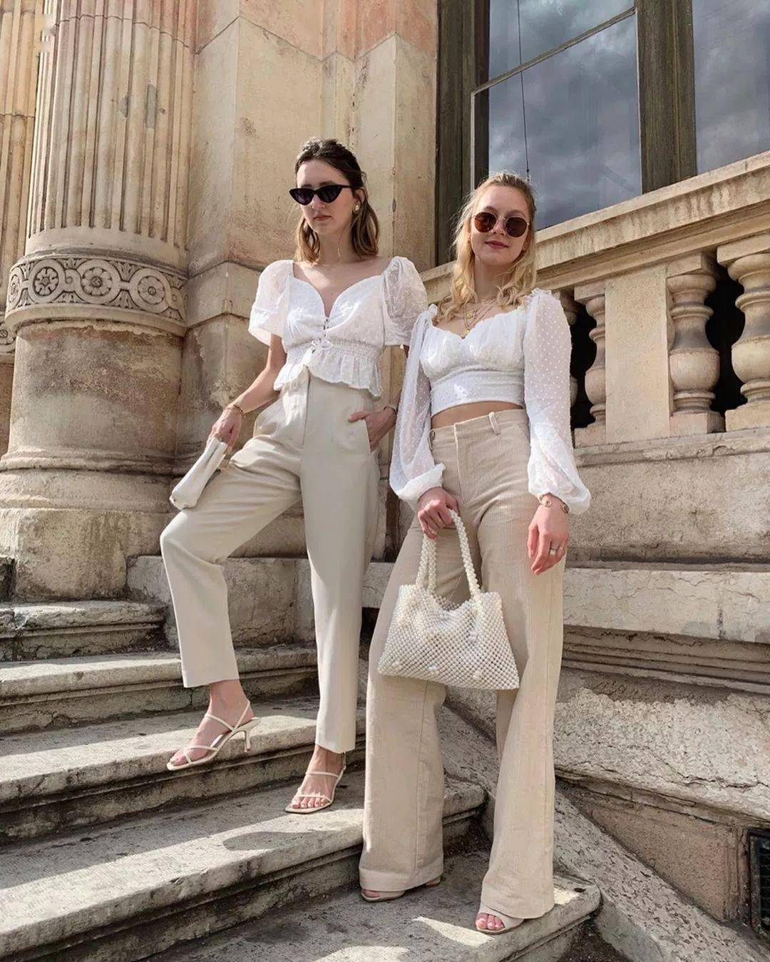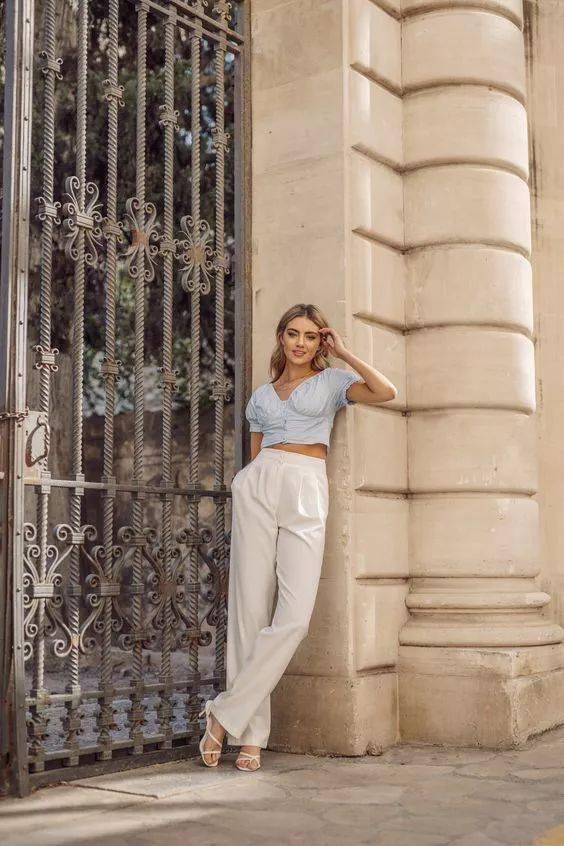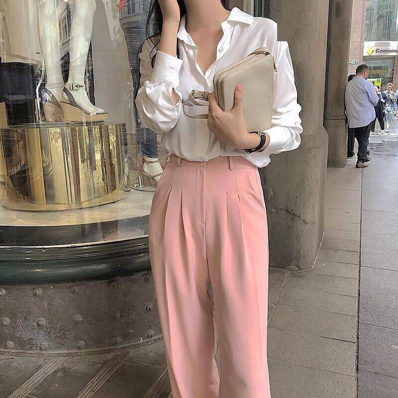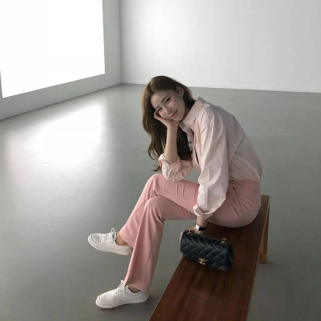 衬衫与奶奶裤在色调上可以有深浅递进,这样可以营造出来的同色系搭配会更具时髦层次感。