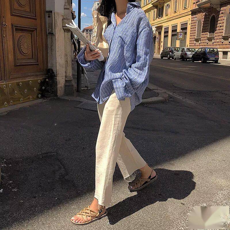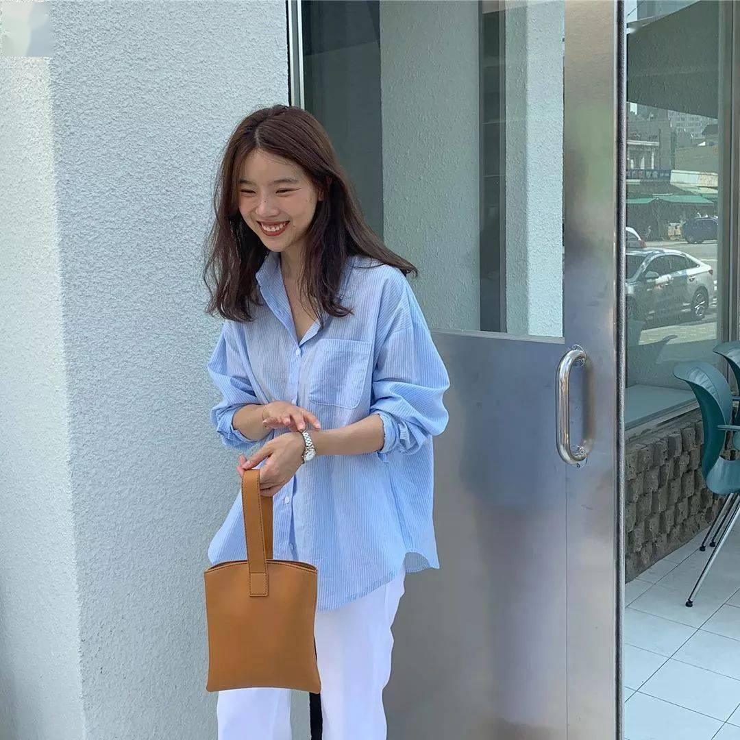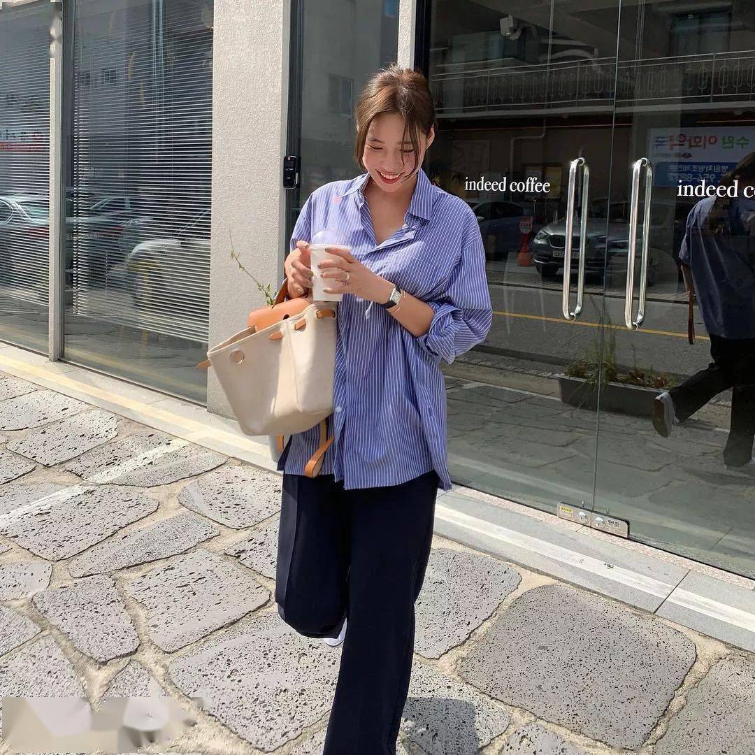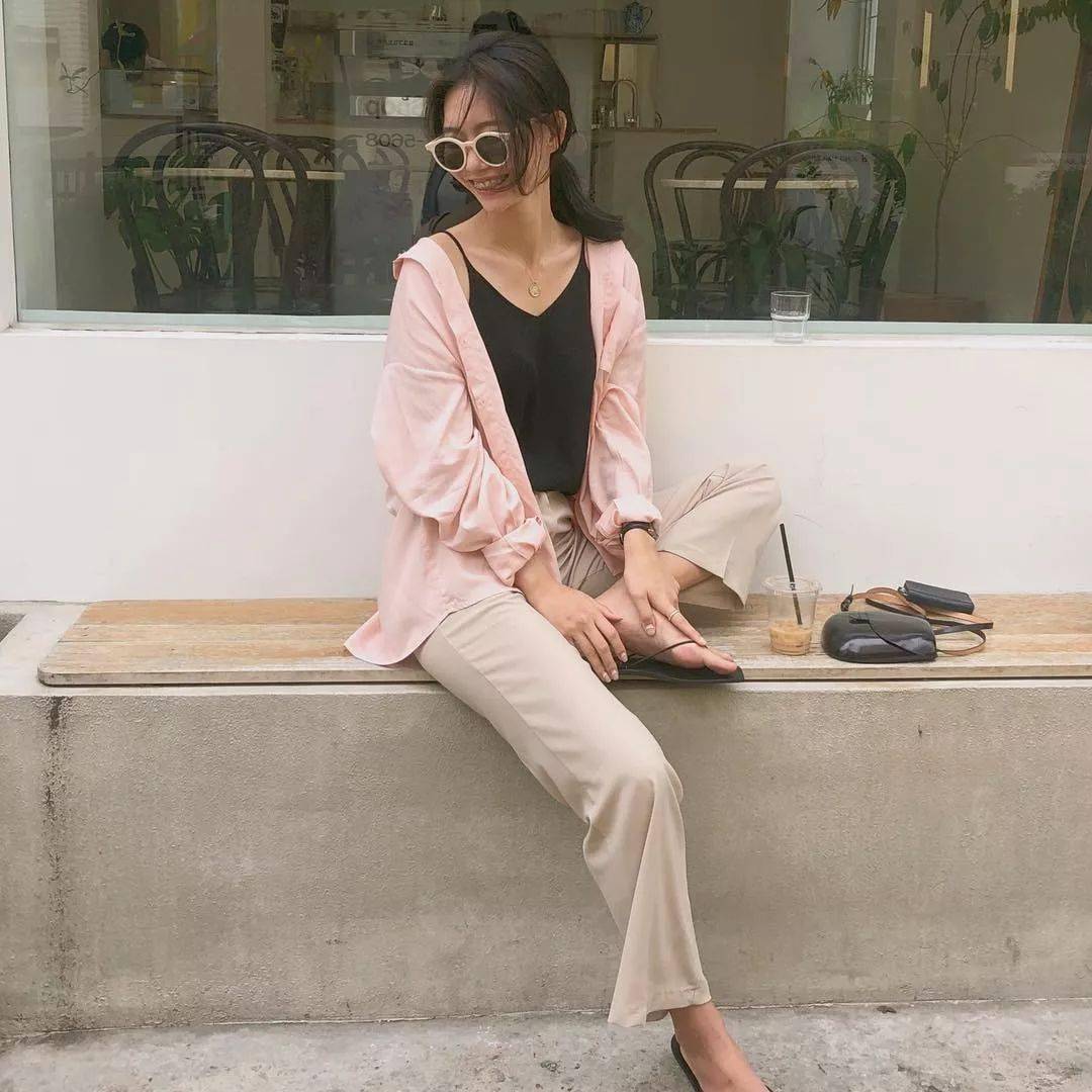 早秋时节多地气温仍然比较高,你可以将oversized衬衫作为薄外套内搭T恤、吊带来搭配奶奶裤