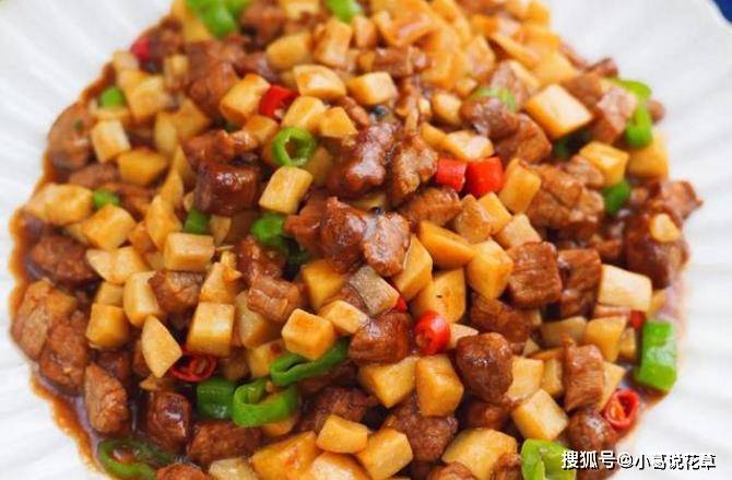 5、然后加入杏鲍菇丁,将牛肉和杏鲍菇翻炒均匀,加入辣酱,生粉包裹在牛肉上就成了酱汁,整个锅里汤汁很浓;