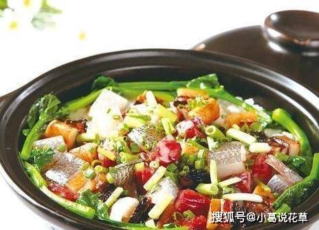 3、将鱼干、腊肉、香肠放在煮好的瓦煲饭上,用文火炖5分钟,撒上香油,撒上葱花。